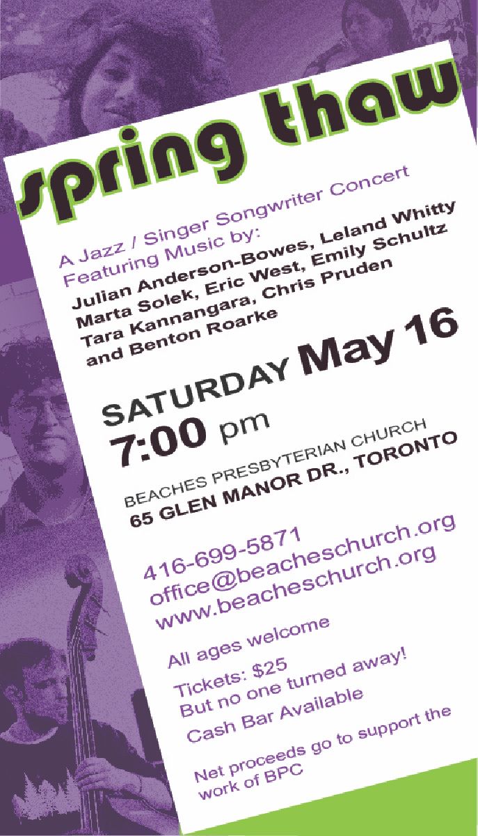 Jazz Servicefeaturing music with music from Julian Anderson-Bowes, Tara Kannangara and Chris Pruden. April 19 10:00am at Beaches Presbyterian Church.